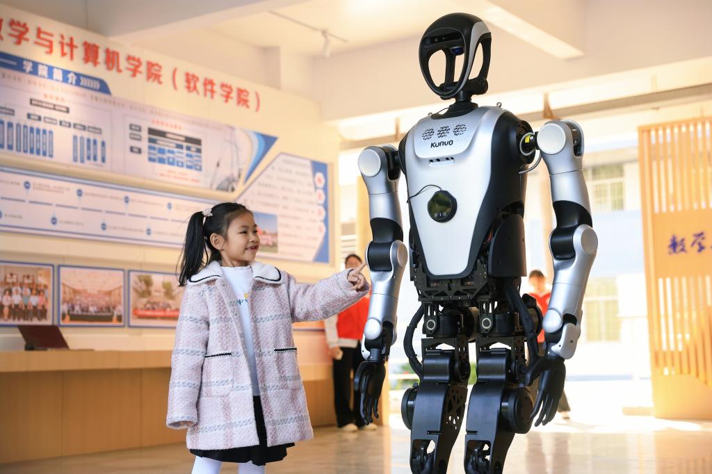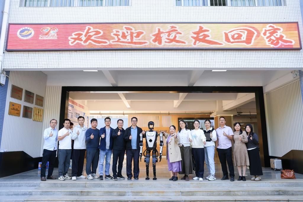 的智能机器人01化身“暖心向导”,凭借矫健的外形和灵活的互动能力,成为接待现场的“小明星”。它不仅能识别校友身份并主动送上问候,还能熟练介绍成人视频