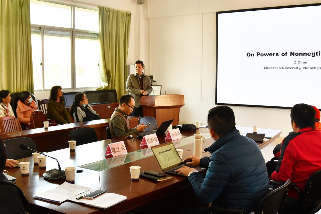 院长陈之兵教授作了题为《关于非负矩阵的幂》的学术报告,他在报告中提出了“0-1矩阵幂运算后非0-1矩阵”的问题,报告由浅入深,内容蕴含数学哲理,增加了在场师生对矩阵的理解,取得了良好的效果。